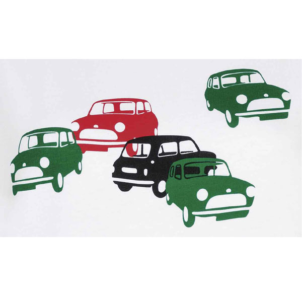 - 經典的MINI車輛圖由水性顏料印製(英國賽車綠、珊瑚紅與黑色),保持衣服的柔軟觸感。