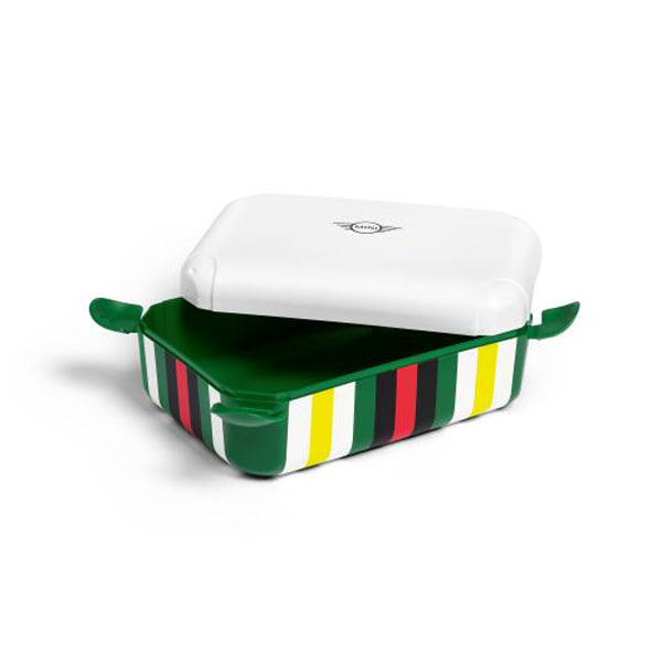 - 帶有線條設計的底部與白蓋子的便當盒。